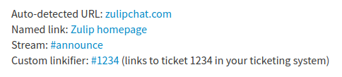 Zulip auto-linkifies URLs and valid stream names. You can also add a